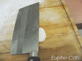 材料: (24個) 餃皮: 澄粉220g,滾水220 ml,鹽1/3小匙,豬油或菜油(沙拉油)1大匙。 餡料: 蝦仁(去殼淨重)400g,帶肥豬絞肉50g。 工具: 拍刀,蒸籠。