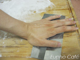 調味料: 鹽1/3小匙,太白粉半大匙,糖半大匙,白胡椒粉1/8小匙,麻油1大匙。 做法: 1. 蝦仁去除腸泥,先取出12隻蝦仁分別橫切成兩半備用,剩下的蝦仁剁碎,加入絞肉一起繼續剁細至產生黏性。 2. 在餡料中依序加入調味料並以同方向攪拌均勻即可。 3. 澄粉加入鹽拌勻,緩緩倒入正滾沸的熱水,並以木匙或筷子攪拌,按壓拌和直到大致成團、看不出粉粒,加蓋或濕布靜置5分鐘至稍涼。 4. 然後用手揉勻成團,加入豬油或菜油拌揉均勻成表面光滑的團狀。在案版上灑一層薄粉(澄粉),放上澄粉團並分切成4等份,每等份搓成長條狀,再分切成6等份,全部放回盆裡蓋上蓋子或擰乾的濕布、保鮮膜等保濕備用。 5. 每次取一個小粉團出來,用掌心稍壓扁(附圖A.),拍刀單面抹薄油,抹油的刀面朝下以大約15度的斜角靠在粉團左側(附圖B.),朝著右側慢慢按推向右,一邊向右推進、一邊向下收近角度按壓(附圖C.),直到刀面與案版幾乎貼平,移開拍刀,就是一張圓形的餃皮了(附圖D.)。 6. 拍好的餃皮放上餡料與半隻蝦仁,包緊收口、摺邊。蒸籠裡的鐵片或盤子先刷上一層薄油,然後排入蝦餃(間隔排列,以免蒸熟後餃皮互相沾黏),水滾之後,上籠以大火蒸約10~12分鐘即可。(如果用大鍋代替蒸籠,水蒸氣比較直接,建議只蒸8分鐘左右,以免破皮。) 7. 可以調一些烏醋與老抽,配一些嫩薑絲,就是很不錯的沾醬了。 愛廚注: 1. 每拍完一張餃皮,就要立刻包餡摺邊,以免餃皮乾裂,其餘粉團也要注意覆蓋保濕。 2. 餡料可以自行變化,這裡寫的是Wendy喜歡的做法,除了剁碎的餡之外,另加入半隻蝦仁,這樣可以同時吃到鮮蝦的口感,我覺得更好吃~~^^ 除此之外,也可以選擇性的加點切碎的筍丁、豬背脂肪、荸薺、燙過的胡蘿蔔丁、豌豆、菠菜等等。須注意的是,蝦仁本身較乾澀,所以最好加入帶肥的肉丁或是脂肪等油脂使口感滑潤。 3. 如果沒有專用的拍刀,可以像我一樣用中式菜刀來拍餃皮,只是菜刀寬度略窄且刀面並非完全平面,可能需要反覆多拍幾次來達到所需的大小與厚度。拍的時候要平穩向右壓推,才能拍出漂亮的圓片,切忌前後推拉拍刀,以免拍出不規則形狀的餃皮。如果使用菜刀,要注意把粉團放在靠近案版邊緣不遠處,讓菜刀的刀柄可以露出案版外面,這樣操作的時候刀柄才不會抵住案版而無法壓平餃皮。 4. 精華區相關文章:蝦餃製作討論。 備註: 1杯= 240 c.c. 1大匙= 1 tablespoon = 15 c.c. 1小匙= 1 teaspoon = 5 c.c. |